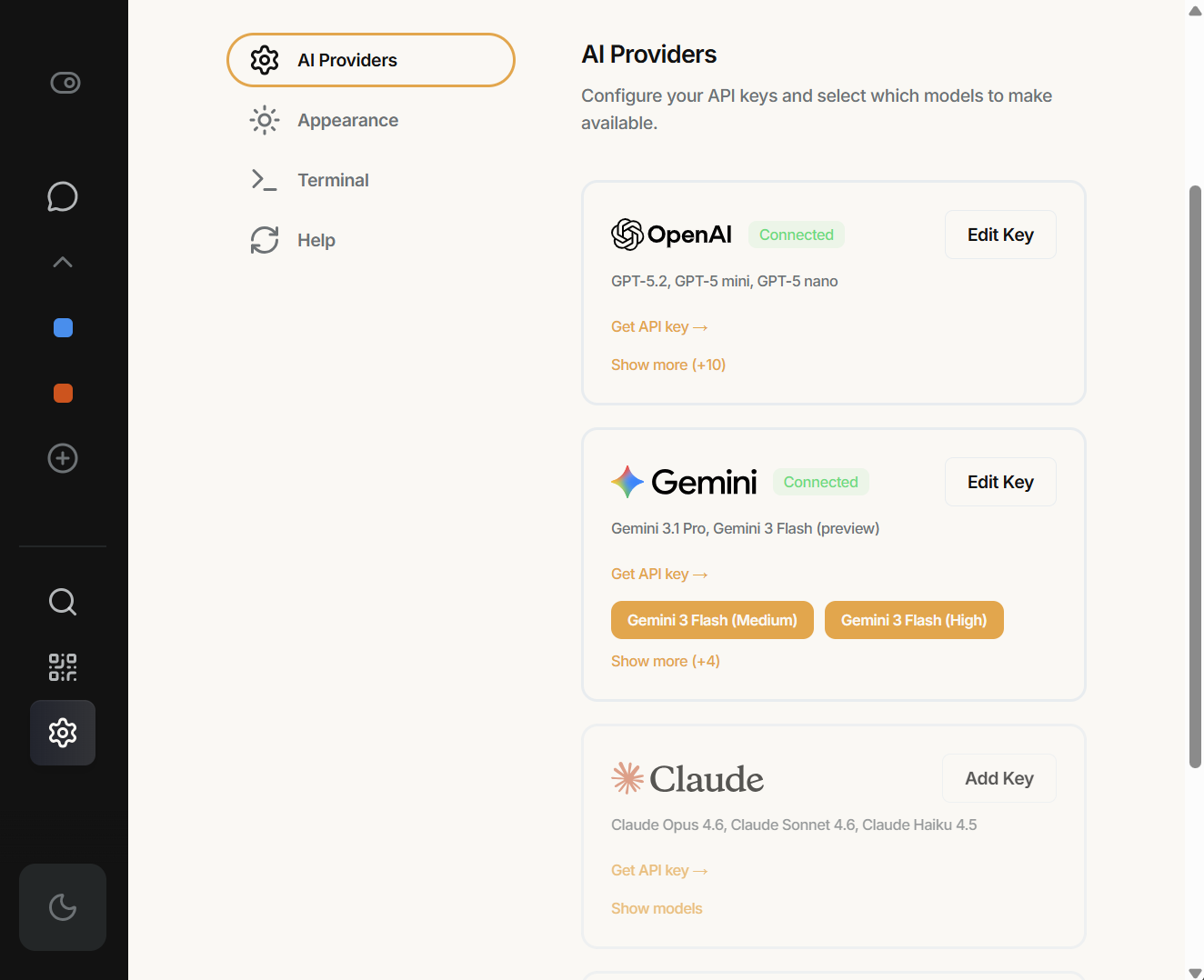 Use the best model for each task. Switch providers without switching apps. Keep full control over your API keys and data.